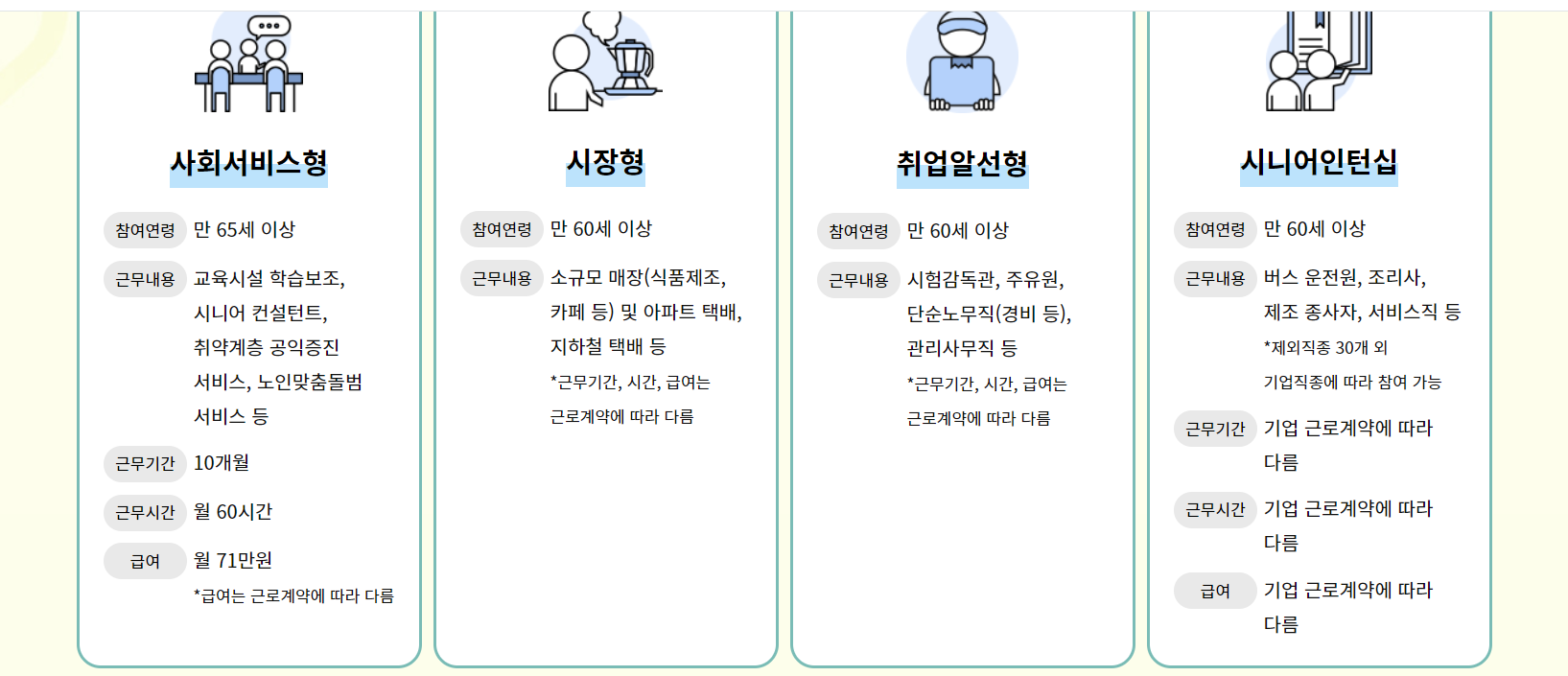 경력과 경험을 활용한 일자리 참여연령 만 65세 이상 근무내용 교육시설 학습보조, 시니어 컨설턴트, 취약계층 공익증진 서비스, 노인맞춤돌범 서비스 등 근무기간 10개월 근무시간 월 60시간 급